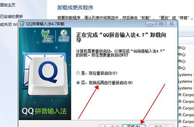 9、在QQ拼音输入法4.7卸载界面,弹出正在完成QQ拼音输入法4.7,卸载向导中在是否现在重新启动选择否,我稍后在自行重新启动然,后选择单击完成按钮。