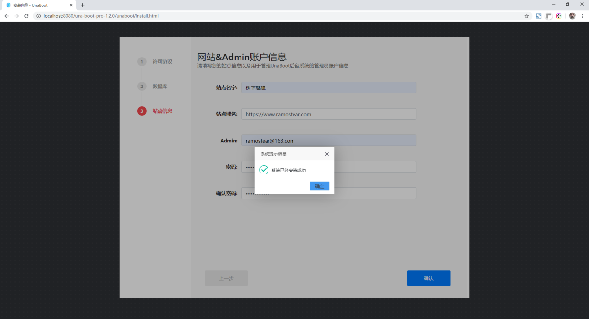 信息确认无误后,点击“确认”按钮,开始初始化博客系统。