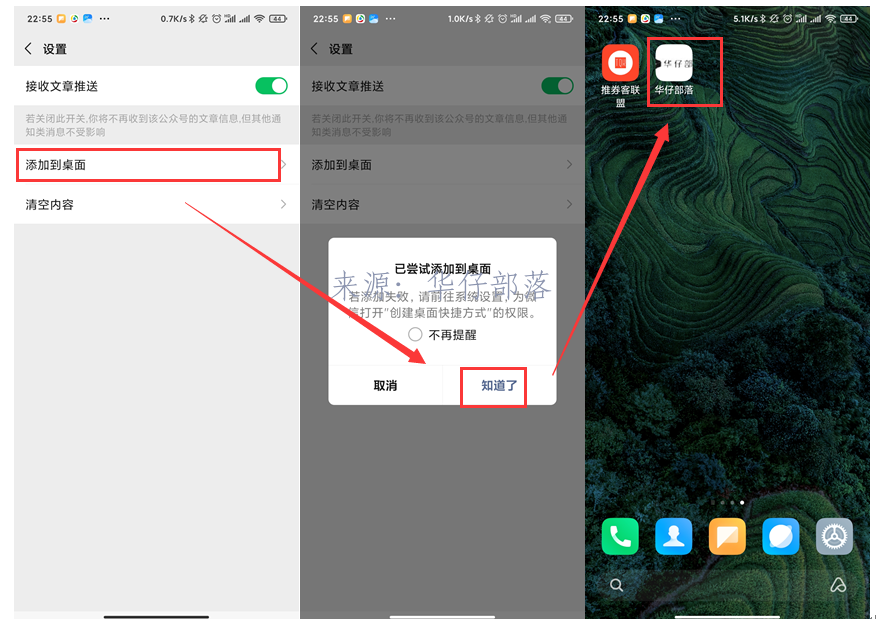 点击添加到桌面,选择知道了,桌面上就有该公众号了,有需要的时候就可以快速打开。