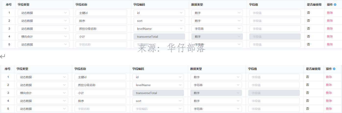 这样的UI效果是可以有组件支持的,那就是SortTable.js。别人造好的轮子,直接拿来用就行了。那么问题在哪里呢?在vue中使用sortTable组件拖拽表格行数据后,影响的只是页面展示效果,实际的数据并没有发生变化,还是原来的顺序。vue是基于数据驱动的,做一些交互操作都是直接修改数据,页面直接渲染的,比如当前页面的字段编码下拉框的选择,这里如果值改变,同时要更改本行的全部数据。所以,如果拖拽后不影响实际的数据,那其他相关的数据交互操作就会出现问题。