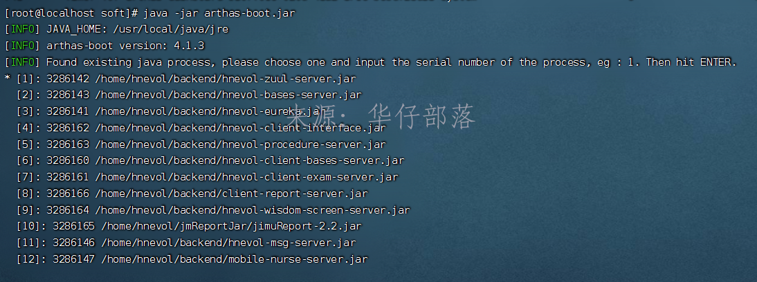 启动后会显示类似如下列表,输入数字(比如1)选择要诊断的 Java 进程,回车进入 Arthas 控制台: