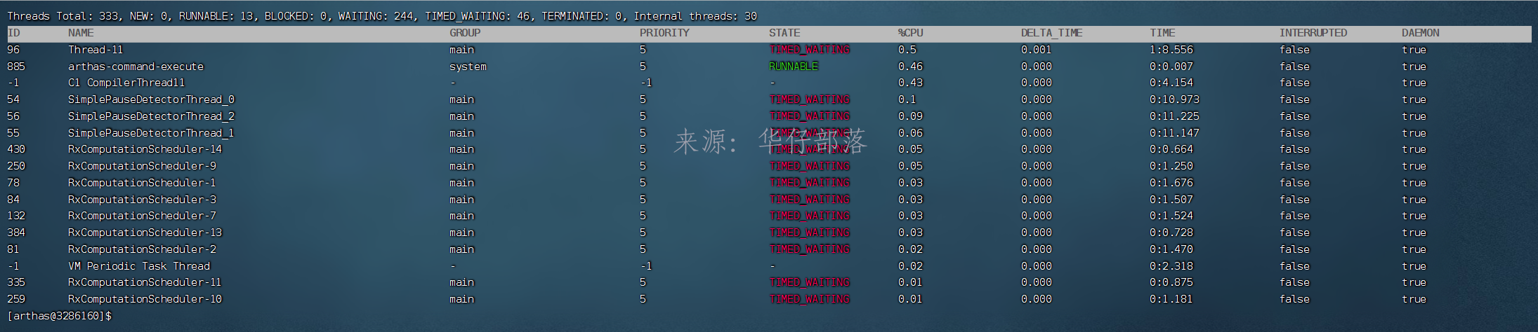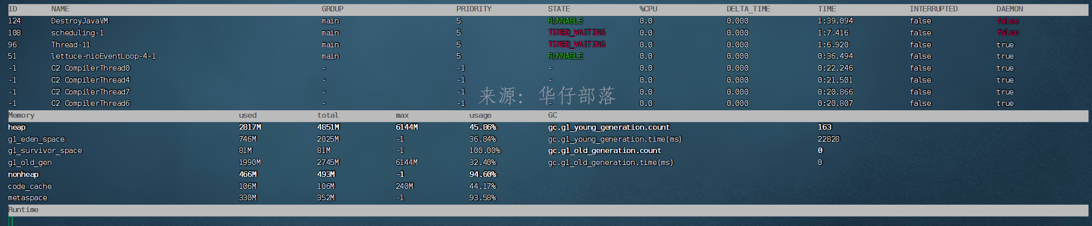 # 查看所有线程状态(ID、名称、状态、CPU占用) thread # 查看阻塞/等待的线程(重点!排查卡顿) thread -b # 找出当前阻塞其他线程的“元凶”线程 thread -w # 查看处于WAITING状态的线程 # 查看指定线程的栈信息(替换为线程ID/名称) thread 46 # 查看ID=46的线程栈,对应JConsole“线程→栈跟踪”
