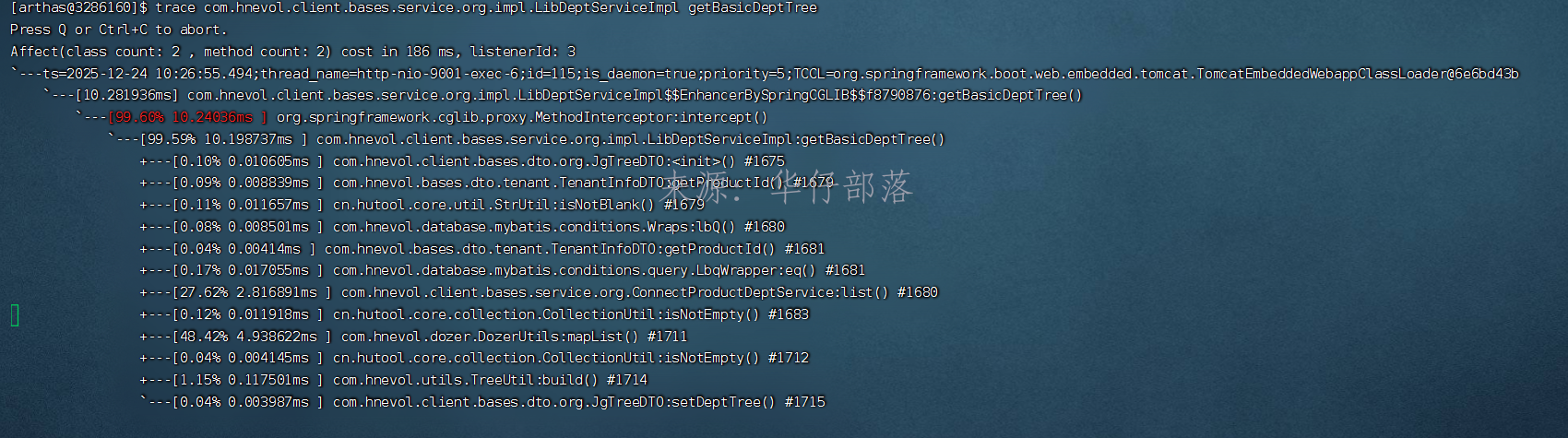 # 基础语法 trace 类全限定名 方法名 [可选参数] # 示例:追踪 com.xxx.Service 类的 queryData 方法 trace com.xxx.Service queryData