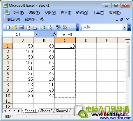 如图中,我在A1中输入50,在B1中输入了60,结果在C1中直接出现了答案:-10。